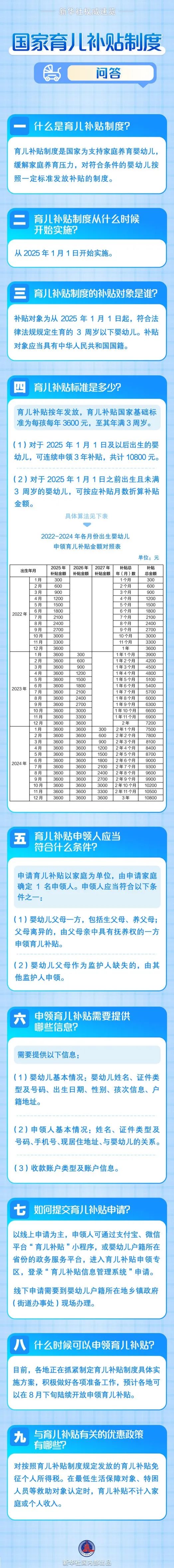 国家建立了全国统一的育儿补贴信息管理系统,强化地区和部门的信息共享。申领时只需提交婴幼儿出生医学证明、户口簿等材料。