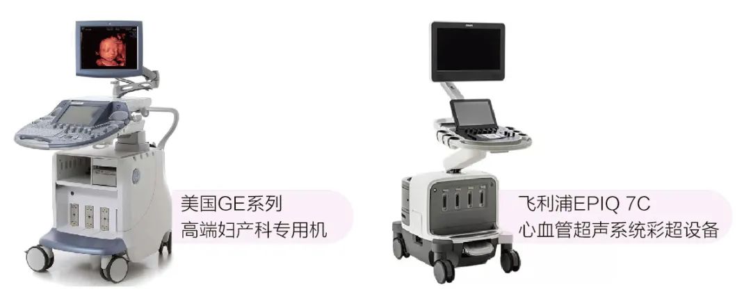 科室拥有美国GE系列高端妇产科专用机、飞利浦EPIQ7C心血管超声系统、东芝超声诊断系统等高端彩超设备。美国GE系列四维彩超,超高清画质,能立体显示胎儿面部、各器官的发育情况,可高效筛查胎儿唇裂、腭裂、骨骼发育异常, 特别适合高危、多胎、心脏等复杂疑难病症筛查、诊断。飞利浦EPIQ7C心血管超声系统采用最前沿的心脏三维超声技术,可全面了解心脏结构和瓣膜形态,主要用于各种心血管疾病的检查诊断,包括冠心病、肺心病、高心病、心肌病、颈部及四肢血管疾病,以及各种先天性心脏病、包括新生儿及胎儿先天性心脏病的筛查。